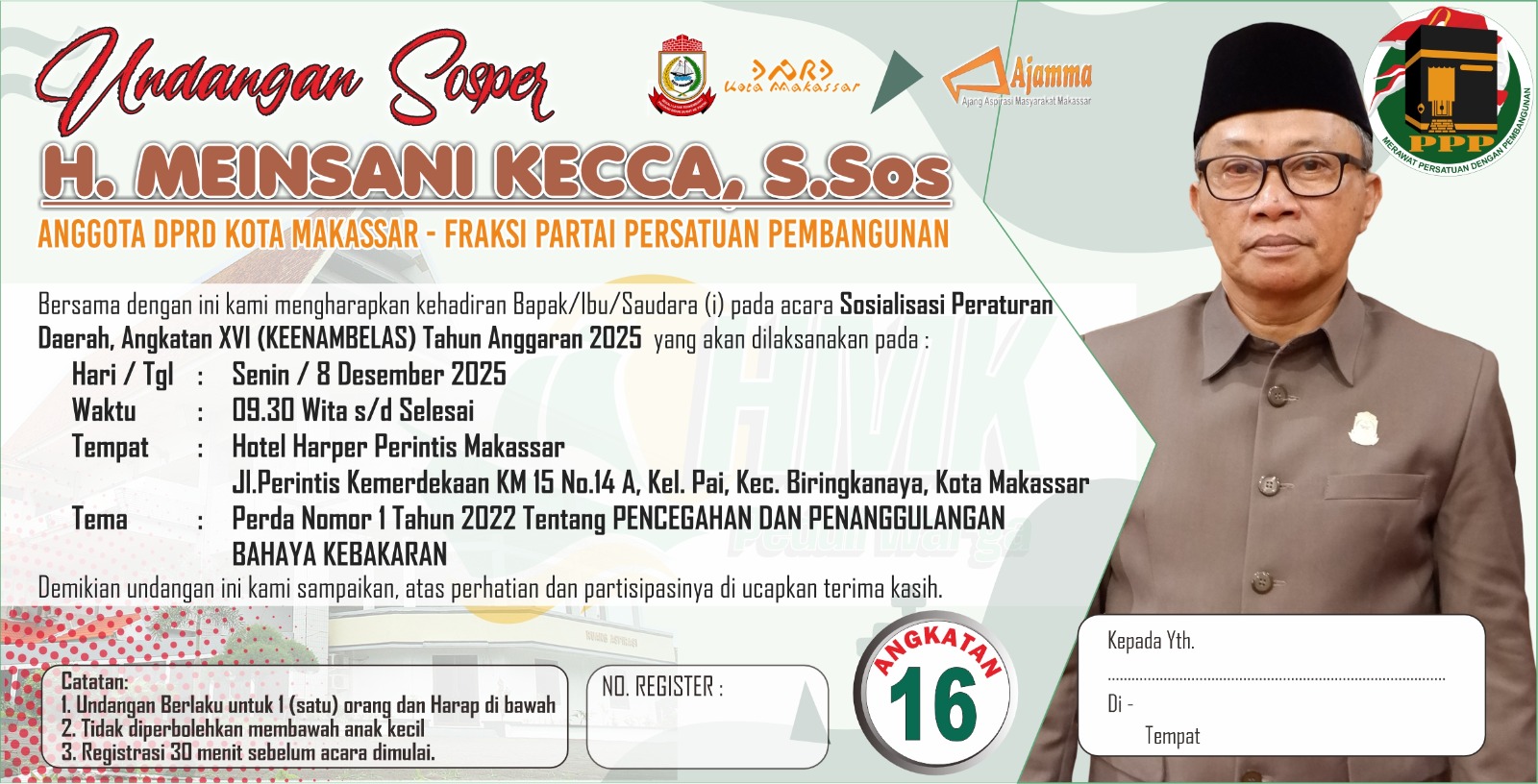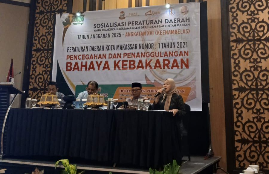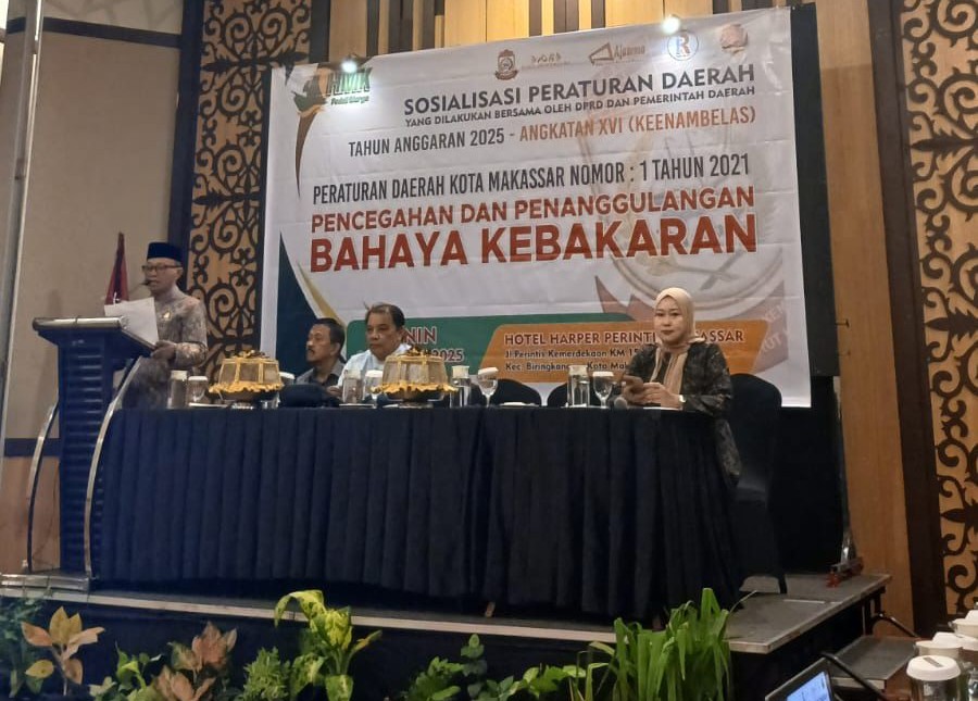 Legislator DPRD Kota Makassar, Meinsani Kecca. S.Sos. menggelar Sosialisasi Peraturan Daerah (Perda) Nomor 1 Tahun 2019 tentang Pencegahan dan Penanggulangan Bahaya Kebakaran, di HARPER HOTEL Makassar, Senin, (08/12/2025). Turut hadir dalam kegiatan sosialisasi sebagai pemateri kali ini, yaitu , dan Dr. Nurhaedah. S.E., S.Ak., M.I.Kom,. CPS. (Dosen Sekolah Tinggi Ilmu Ekonomi LPI Makassar)